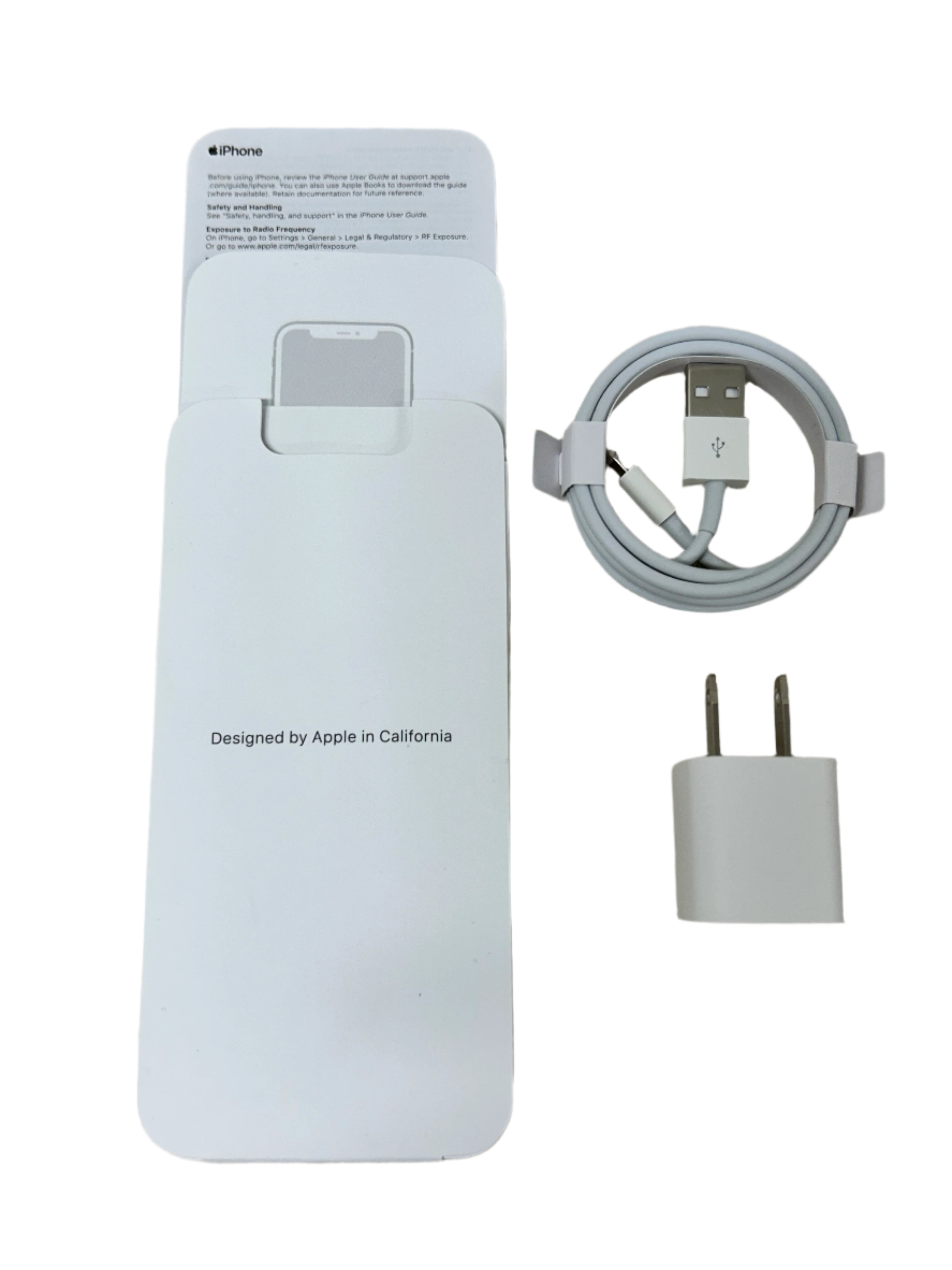 Your phone comes with a new Lightning cable charger inside the retail box, along with documentation.